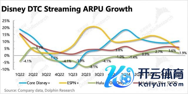 2)体育业务存在季节性波动,系缚提高内容变现遵循。当季赛事云集,蛊惑了巨额了用户不雅看,并因此赢得了不少告白收入。但当季也出现了较高的本钱压力,使得利润率下落至 5%。不外阛阓预期原来更低,但公司通过系缚 Disney+ 扩大 ESPN+ 的用户规模,在内容资源复用下,提高了盈利智商。天然年头公司因反把持诉讼,不得已取消了与福克斯、华纳昆仲共同推出 Venu 瞎想,但 ESPN 旗舰版(整合有线频说念通盘体育内容)将按照原瞎想于 2025 年 8 月推出。