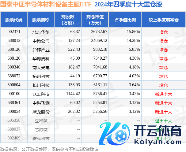 国泰中证半导体材料建立主题ETF为指数型-股票基金,凭证最新一期基金季报表现,该基金钞票成就:股票占净值比99.28%,无债券类钞票,现款占净值比0.75%。基金十大重仓股如下: