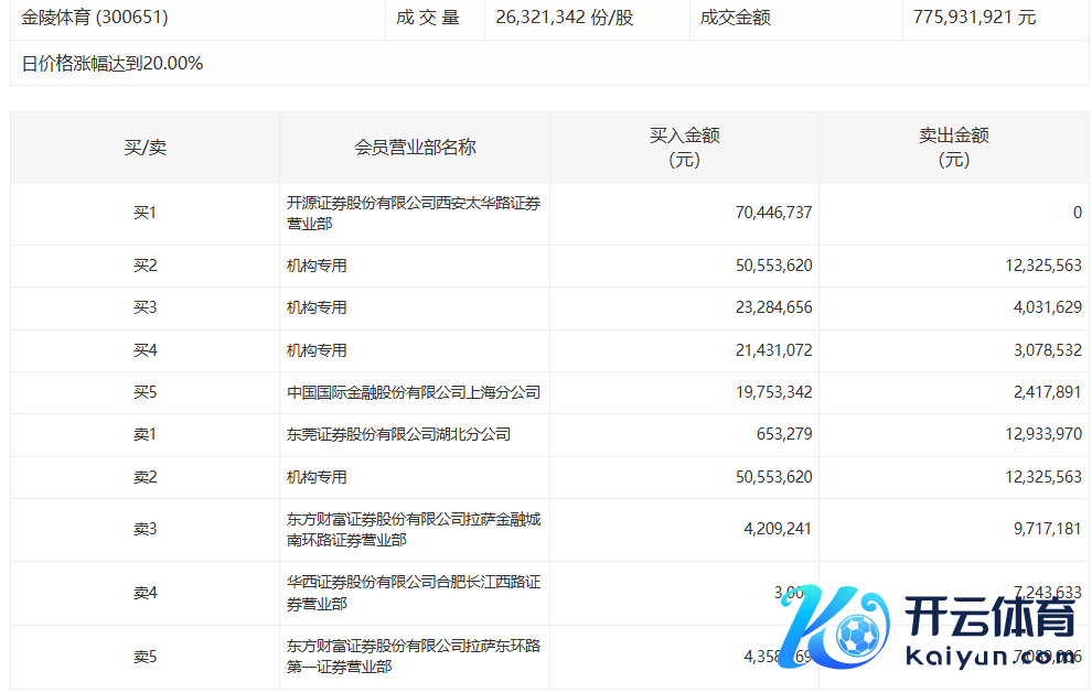 金陵体育当天涨20.00% 3家机构专用席位净买入7583.36万元金陵体育当天涨20.00% 3家机构专用席位净买入7583.36万元
